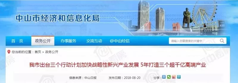 六,全国名企在中山。在中山市经济和信息化局公布了新政策,中山要打造战略性新兴支柱产业,调整产业结构、塑造新的产业优势,必须瞄准高端高新,推动产业向全球价值链高端攀升,抢占产业发展制高点。