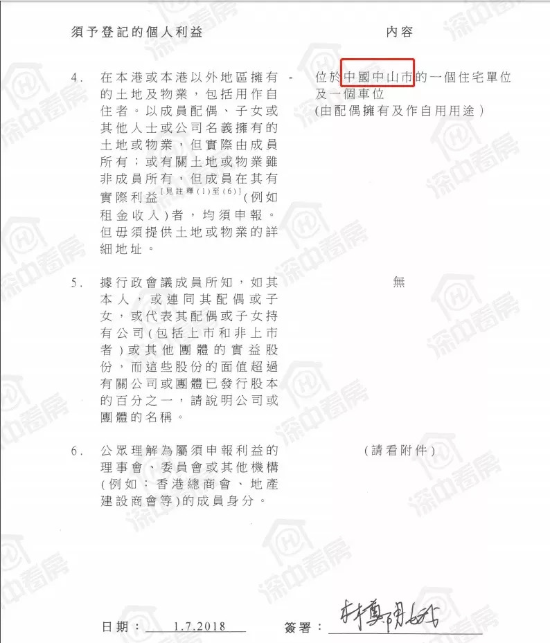 香港特首林郑月娥较新的个人利益申报资料显示:她没有担任任何 “公共或私营公司的受薪董事职位”,在香港亦没有房产,但在中山市有一个住宅单位及一个车位。报表上,有林郑月娥的亲笔签名。