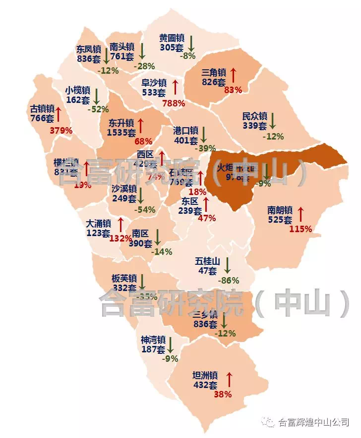 根据合富研究院(中山)监测:2018年上半年中山市住宅成交12831套,同比上升1081套,9%; 在2018年上半年中山市各镇区住宅成交里,东升镇成交1535套排名排名前列,同比去年上升626套,68%;火炬开发区成交978套,同比下降9%,排名第三的是东凤镇成交836套。2018年上半年成交同比成交上升最明显的是阜沙镇,大涨788%。中山各板块成交中,占比较大的是西北板块,共成交4119套,占比32%.