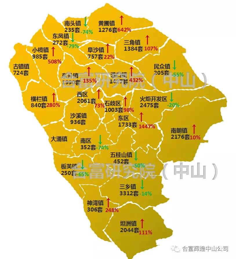 在今年各镇区的住宅成交里,东升镇,火炬开发区,三乡镇成交最多共计3394套,占全市成交的27%,同比去年的成交来看,今年各镇区的成交更为平均,各镇区均有成交出现。