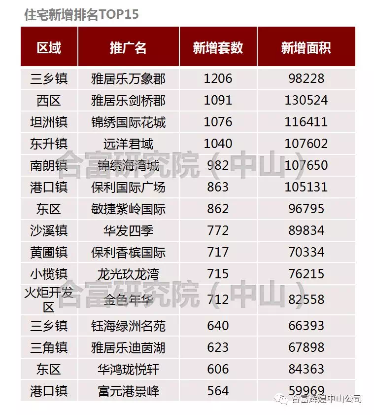根据合富研究院(中山)监测: 在2018上半年中山市各楼盘住宅新增排名里,三乡镇雅居乐万象郡新增1206套排名排名前列,其次是西区雅居乐剑桥郡新增1091套,排名第三的是坦洲镇的锦绣国际花城1076套。