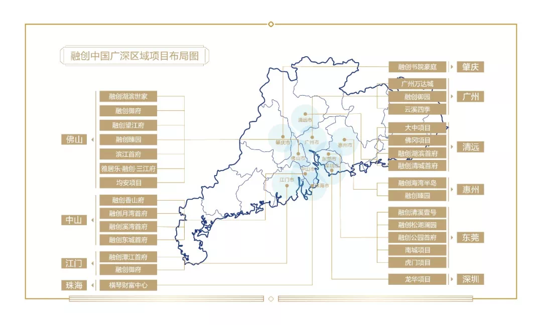 2016年,融创正式进入广深区域,并迅速扎根,从排名前列个项目落子佛山开始,到如今进入深圳、广州、佛山、东莞、惠州、中山、江门、珠海、清远、肇庆等10座城市共布局30余个项目。