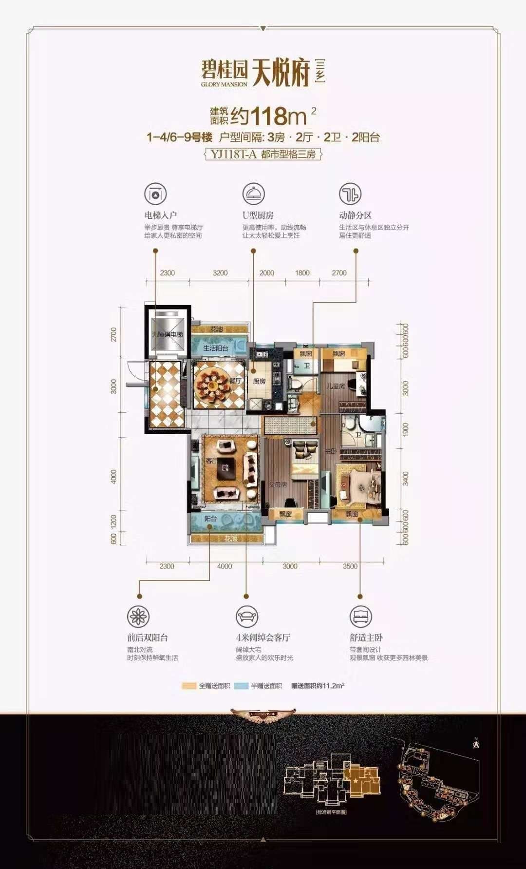 户型楼层:YJ118(103㎡295套、118㎡385套,1#、2#、3#、4#、6#、7#、8# 皆为18层,9# 为34层) ,YJ180(180㎡ 34套,5# 为17层), YJ143(139㎡198套,10#、11# 为33层)