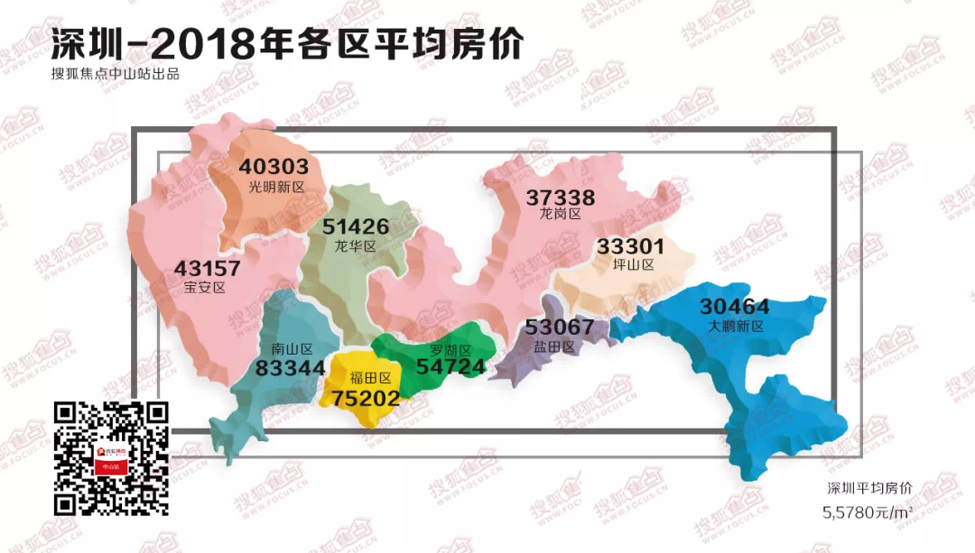 面对一路走高的中山房价,我们还应该看看未来一桥之隔的深圳。深圳2018年的各区平均房价为55780元/㎡,比同期中山平均房价多了整整5倍的价格。