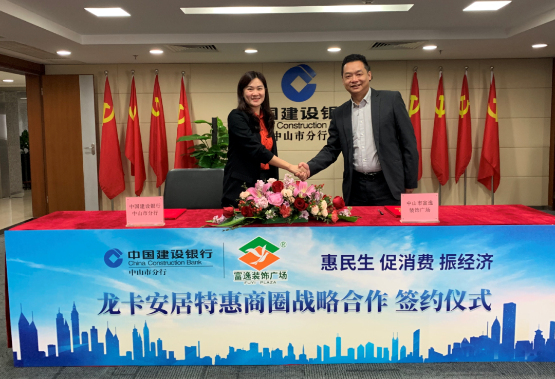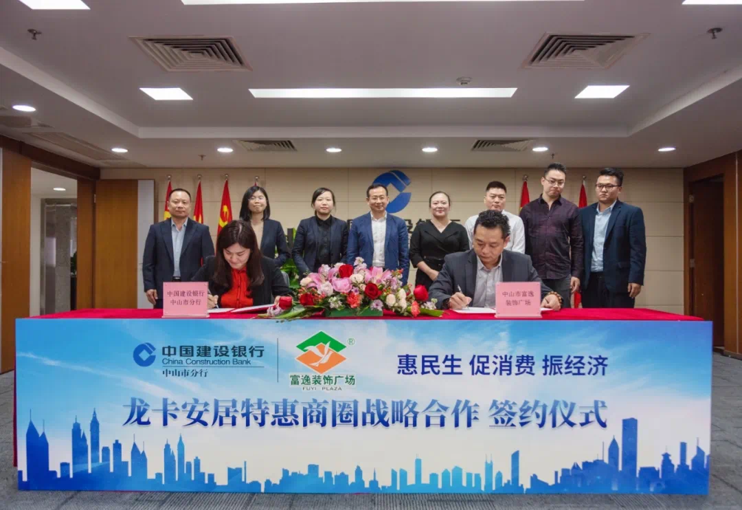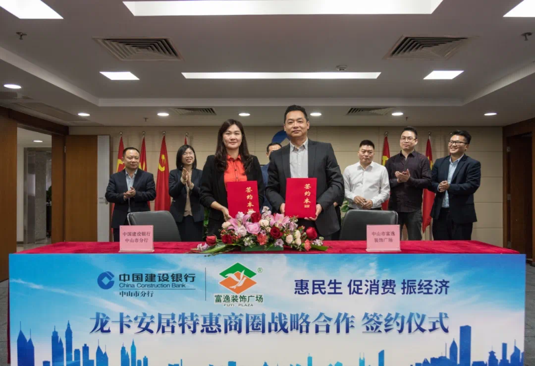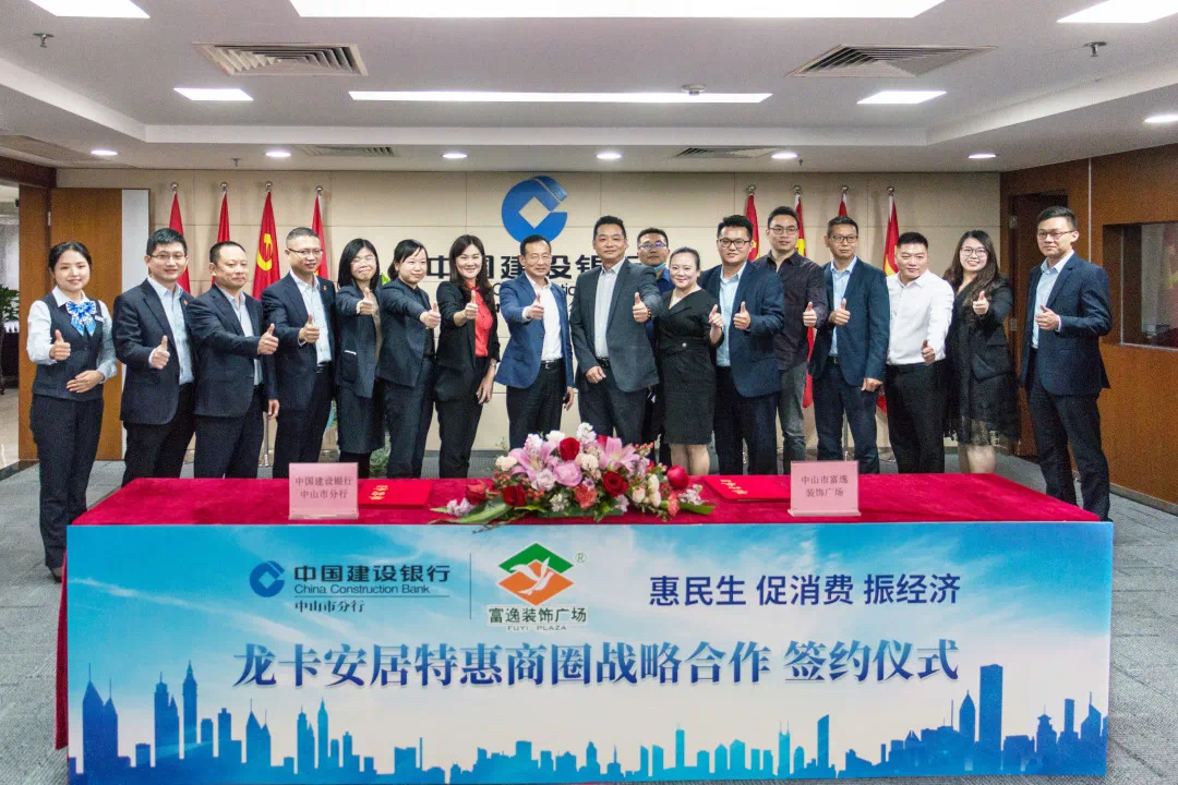 2020年4月15日,中山市富逸装饰广场与中国建设银行中山市分行签署了战略合作协议,携手打造“龙卡安居特惠商圈”,领创银企“联姻”合作新模式,是全省首创之举,为双方客户创造更大的价值,也为双方企业提升在竞争力探索新路。