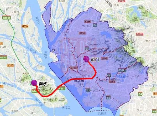 片区—广州南沙:由虎门高铁站出发,经莞太路、莞佛高速、虎门大桥、金岭路到达广州南沙地铁金洲站,公交运营线路全长约28公里,沿线覆盖虎门高铁枢纽、南沙客运站、南沙港等客流点。