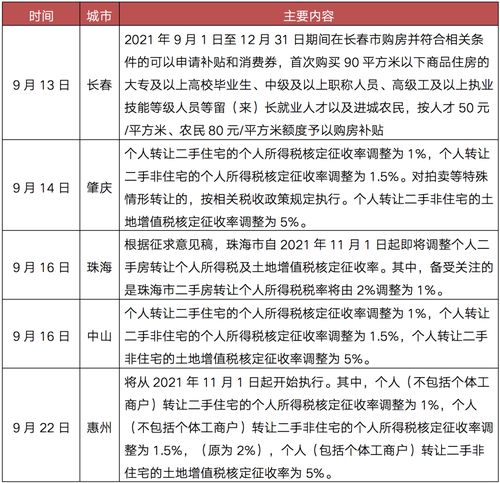 除限跌之外,长春、珠海等5城在财税层面出台支持性政策,缓解房地产市场下行压力。其中长春发布购房补贴,肇庆、珠海、中山、惠州相继下调二手住宅转让个税核定征收率,降低二手房交易成本。