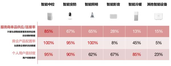 本轮《意见》的发布同时也给智能设备的供应商和系统商带来了新的机遇,针对智能家居产品的实际应用情况,克而瑞分别从供应端、房企配置率和用户偏好三个角度对智能家居产品的应用程度进行调研分析,发现除了安防、照明等基础应用关注度较高以外,智能中控系统已经成为各方最为关注的焦点。