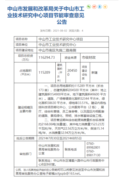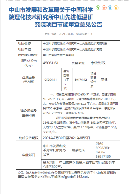 日前,中山发改局连续发布了3条关于中山科技创新园三个子项目的审查意见公告,分别是中山光子科学中心项目、中山先进低温研究院项目、中山市工业技术研究中心项目。