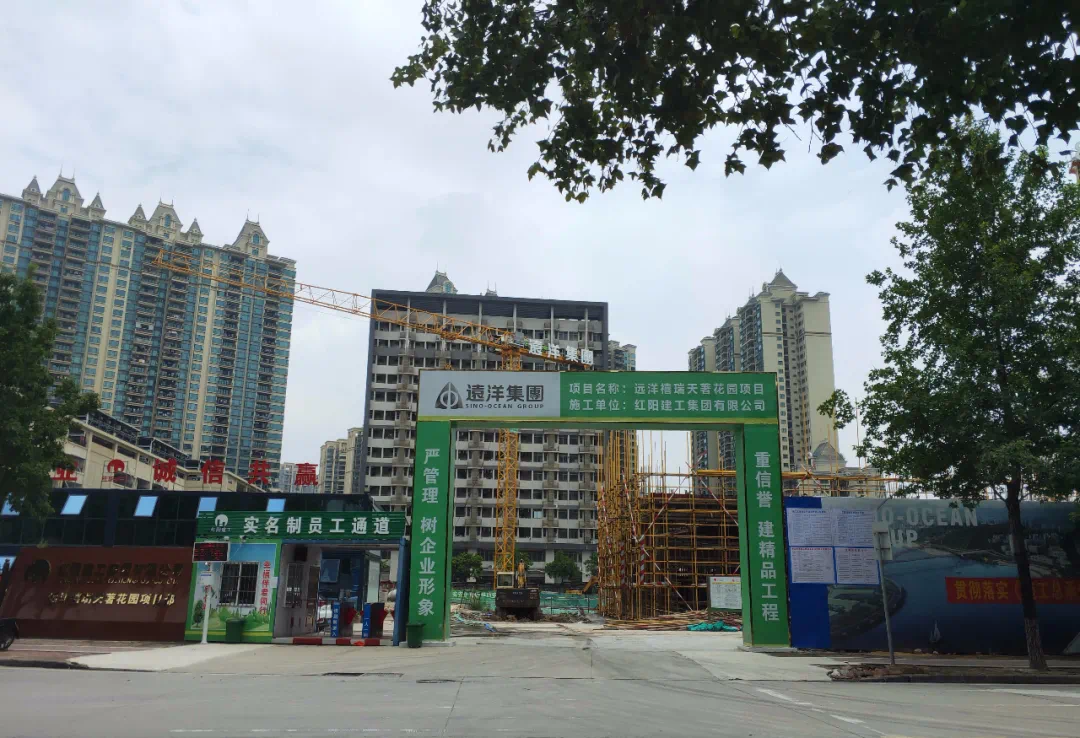 通过现场观察,已有部分建筑实体露头。场内工人汗水淋漓,场外机械车频繁进出。目前远洋天著已开设展厅,计划8月14日开放售楼部。