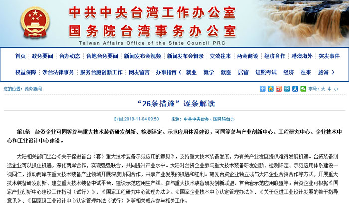 今日(11月4日),国务院台办、国家发展改革委经商中央组织部等20个有关部门,出台《关于进一步促进两岸经济文化交流合作的若干措施》(以下简称“26条措施”),自公布之日起施行。