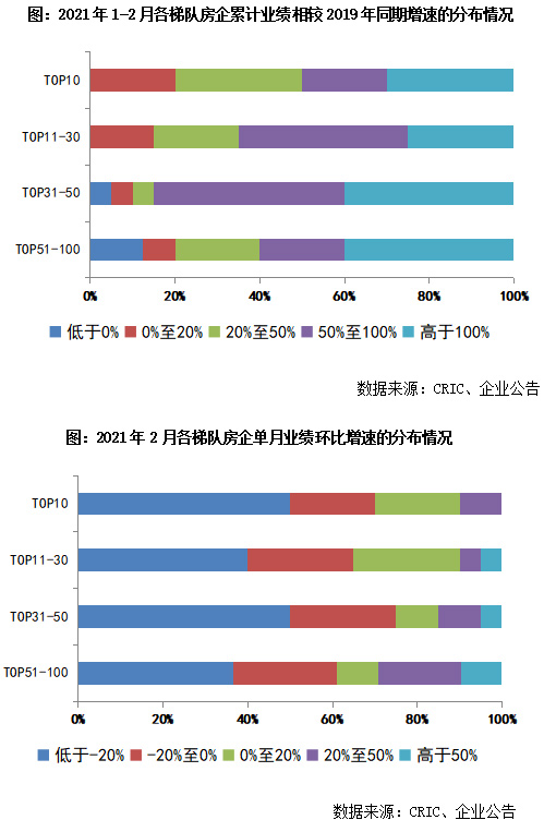 具体到企业表现,百强房企前两月累计业绩增速与2019年同期相比,大中型房企增长趋势更为突出。根据报告,TOP30房企相较2019年同期业绩更好,其中过半企业累计同比增速超过50%。TOP31-50梯队房企中,17家企业相较2019年同期增速高于50%,占比高于其他梯队。