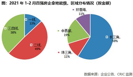 另外,从投资方面上看,2月末百强房企投资中半数集中于二线城市,一线、三四线城市分别占13%和38%。其中,百强房企投资金额中有近六成位于长三角,其次中西部占19%,珠三角和环渤海分别仅占11%。截止2月末,百强房企拿地金额TOP20城市中,有7个三四线城市上榜,全部来自长三角。