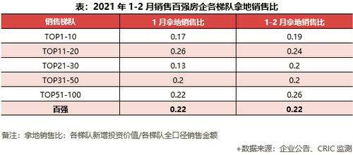 根据报告,1-2月份百强拿地销售比为0.22,企业投资态度保持谨慎。值得注意的是,截止2月末仍有三成百强房企尚未纳储。从分梯队来看,10强房企最为谨慎,拿地销售比为0.19;而11-20强、51-100强房企投资积极性相对较高,拿地销售比分别为0.24和0.26。
