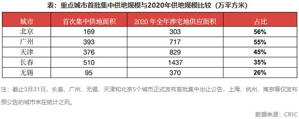 从首批已经集中供地的5个城市来看,除无锡外,其余四城供应均十分“给力”,占2020年全年宅地供应面积的比重均超35%,尤其是北京和广州,分别为56%和55%,较2020年已过半,其次是天津,比重也达45%。总体供地节奏快于往年同期平均值。