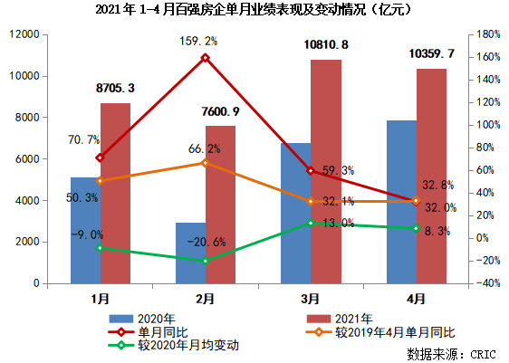 报告显示,4月份百强房企单月实现销售操盘金额10359.7亿元,同比增长32%,环比微降4.2%,较2020年月均销售规模增长8.3%。1-4月份,百强房企累计销售操盘金额同比增长65.3%,较2019年同期增长近42.3%。如果从全口径销售金额核算,1-4月百强房企销售额高达42824.4亿元,同比增长66.6%。