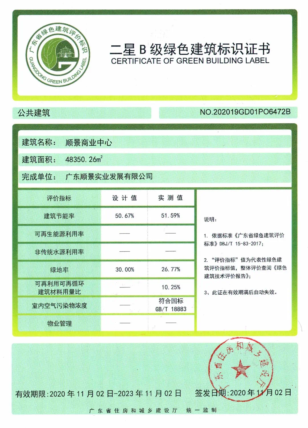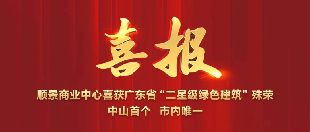 2020年,由顺景实业开发的顺景商业中心项目,荣获广东省住房和城乡建设部颁发的“二星级绿色建筑设计标识证书”,成为中山市建筑领域排名前列,也是少有一个获此殊荣的项目,此证书代表了广东省建筑设计的创新趋势与潮流。