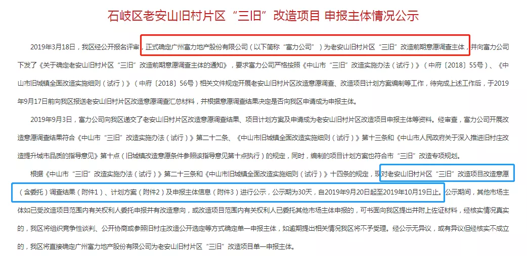 今天(2019年9月20)上午,石岐区办事处发布《石岐区老安山旧村片区“三旧”改造项目申报主体情况公示》,确定富力公司开展改造意愿调查结果符合“三旧”改造计划!