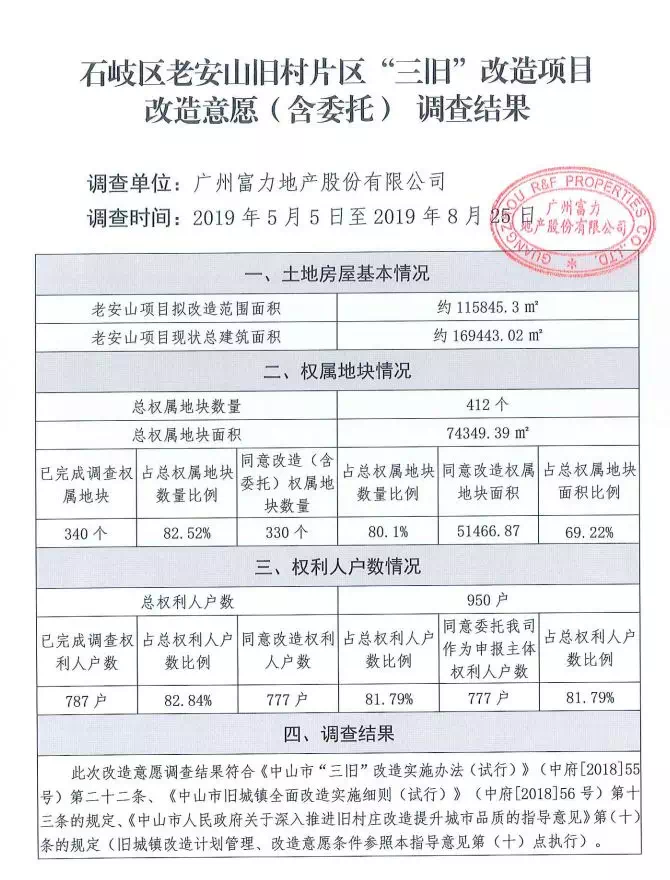 并且,根据现阶段改造的意愿调查情况统计,该片区总权利人户数为950户。已完成调查权利人户数为787户,其中777户权利人同意更新改造及同意委托广州富力地产股份有限公司申报改造。