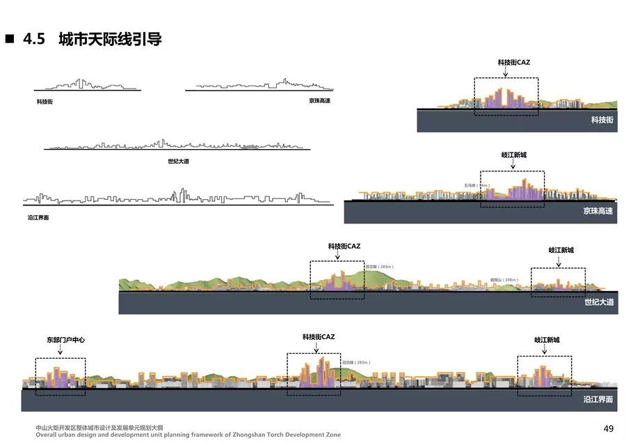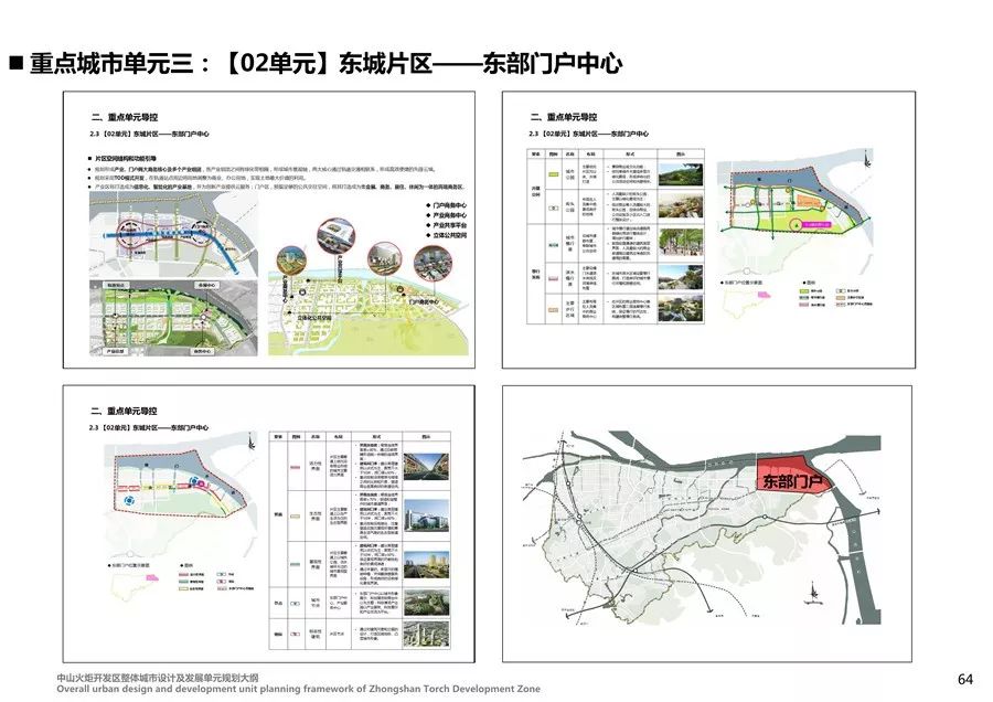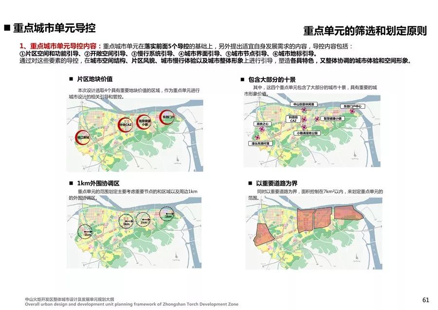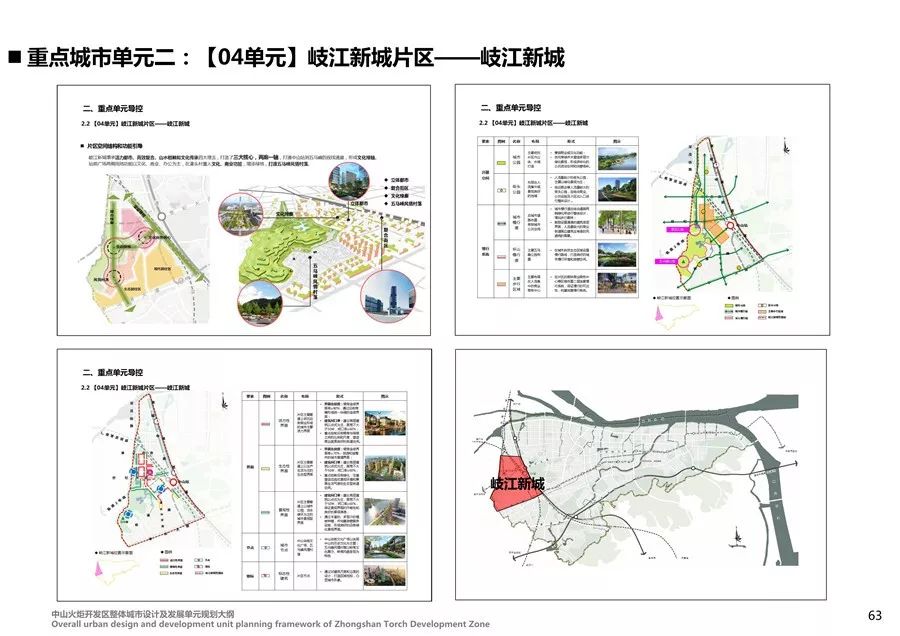 重点规划中心片区——中央CAZ、岐江新城片区——岐江新城、东城片区——东部门户中心、东城片区——智慧健康小镇四大单元。