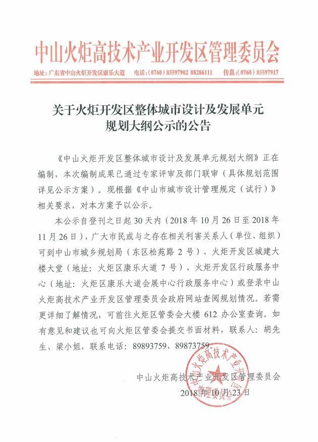 房讯网中山消息 10月23日,中山火炬开发区管理委员会发布了一则关于火炬开发区整体城市设计及发展单元规划大纲公示的公告,本次规划设计将以“360°水岸绿城,24h活力智炬为火炬整体城市设计总体目标,重点规划中心片区——中央CAZ、岐江新城片区——岐江新城、东城片区——东部门户中心、东城片区——智慧健康小镇四大单元。