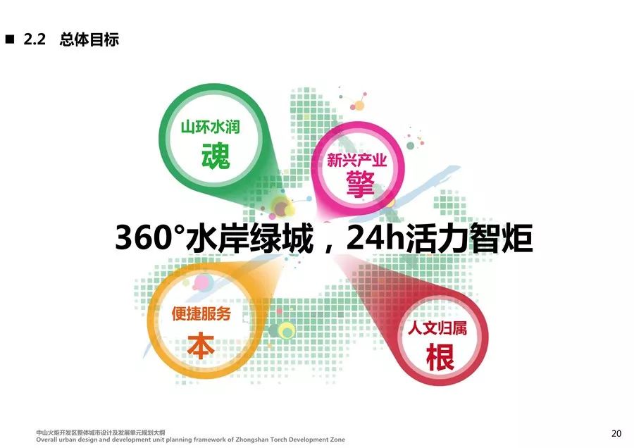 在国家‘一带一路’重要战略背景下,中山作为珠江西岸的重要智造强市,应抓住深中通道带来的契机,西联东拓积极融入粤港澳大湾区高级城市群。基于火炬开发区生态的优质土壤,应对火炬开发区独特的发展需求,整体设计和组织城市公共资源,塑造火炬开发区“360°水岸绿城,24h活力智炬”的鲜明城市特征,传递出 “智造之城、科技之城、健康之城”的火炬城市精神。