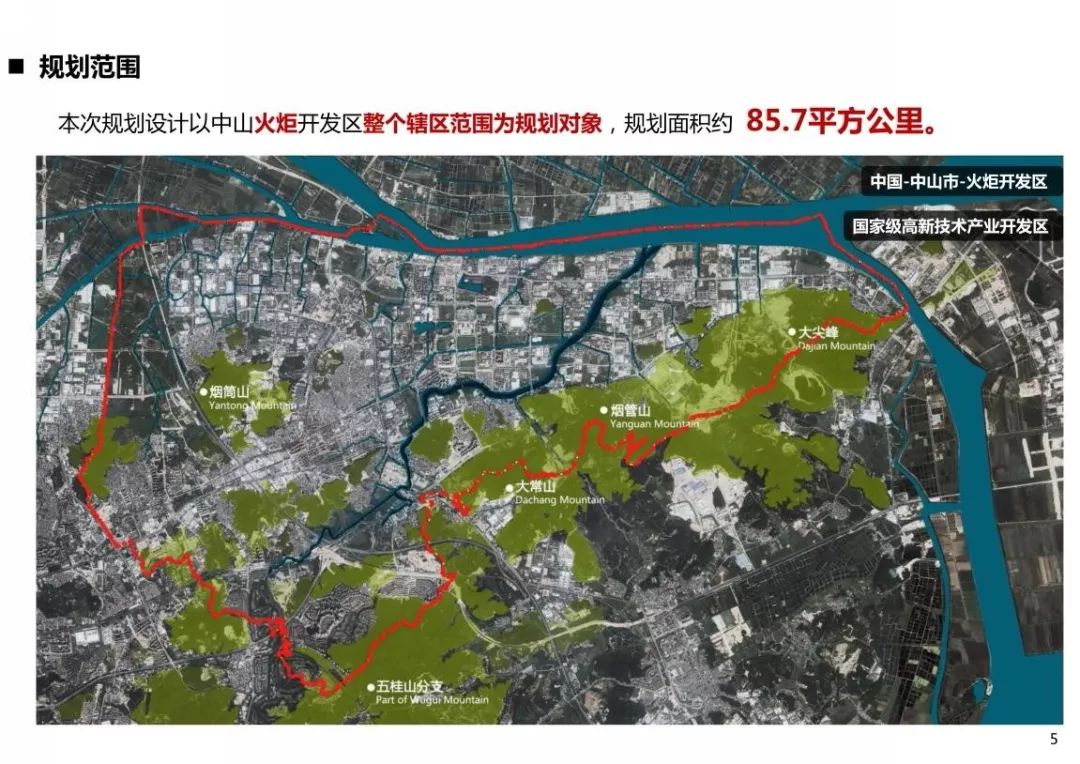 本次规划设计以中山火炬开发区整个辖区范围为规划对象,规划面积约 85.7平方公里(约12.8万亩)。