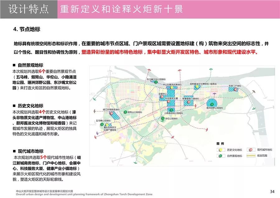 本次规划共选取5个现代城市性地标(岐江新城商务地标、门户中心地标、会展中 心、科技服务大厦、健康产业小镇地标)来展示火炬区现代化的城市形象和建设风貌,塑造火炬区的天际轮廓线。
