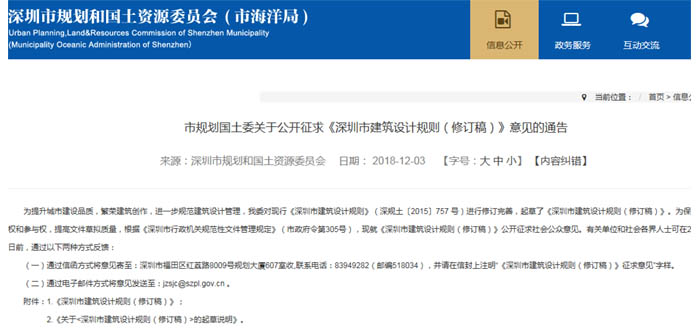 为保障公众的知情权和参与权,提高文件草拟质量,根据《深圳市行政机关规范性文件管理规定》(市政府令第305号),有关单位和社会各界人士可在2018年12月13日前就《深圳市建筑设计规则(修订稿)》提出反馈意见。