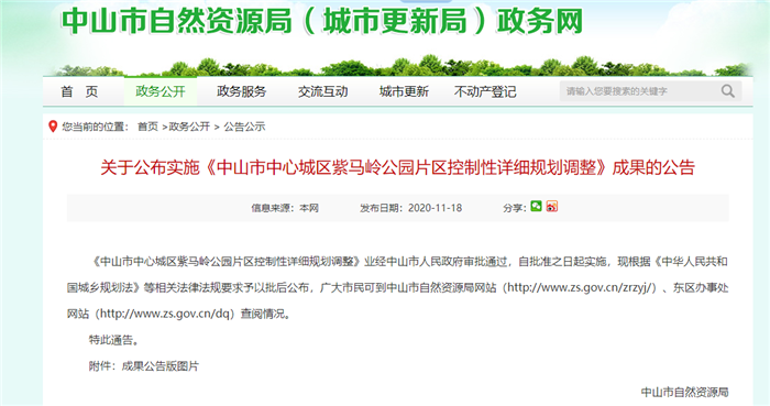 11月18日,中山市自然资源局发布了实施《中山市中心城区紫马岭公园片区控制性详细规划调整》成果的公告。