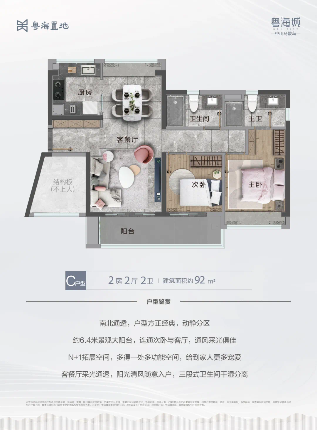 N+1空间拓展户型设计,满足不同人对居住空间的需求最能迎合当前人居需求的莫过于N+1创意户型的设计。中山马鞍岛粤海城每一户型均为马鞍岛内稀缺的N+1“长大”空间,可通过变换形式来实现扩大原有区域的面积,或者是实现书房、茶室、影视房等功能。N+1户型不仅拥有实用的空间价值,还能容纳情怀的精神需求,打造全新理想人居。