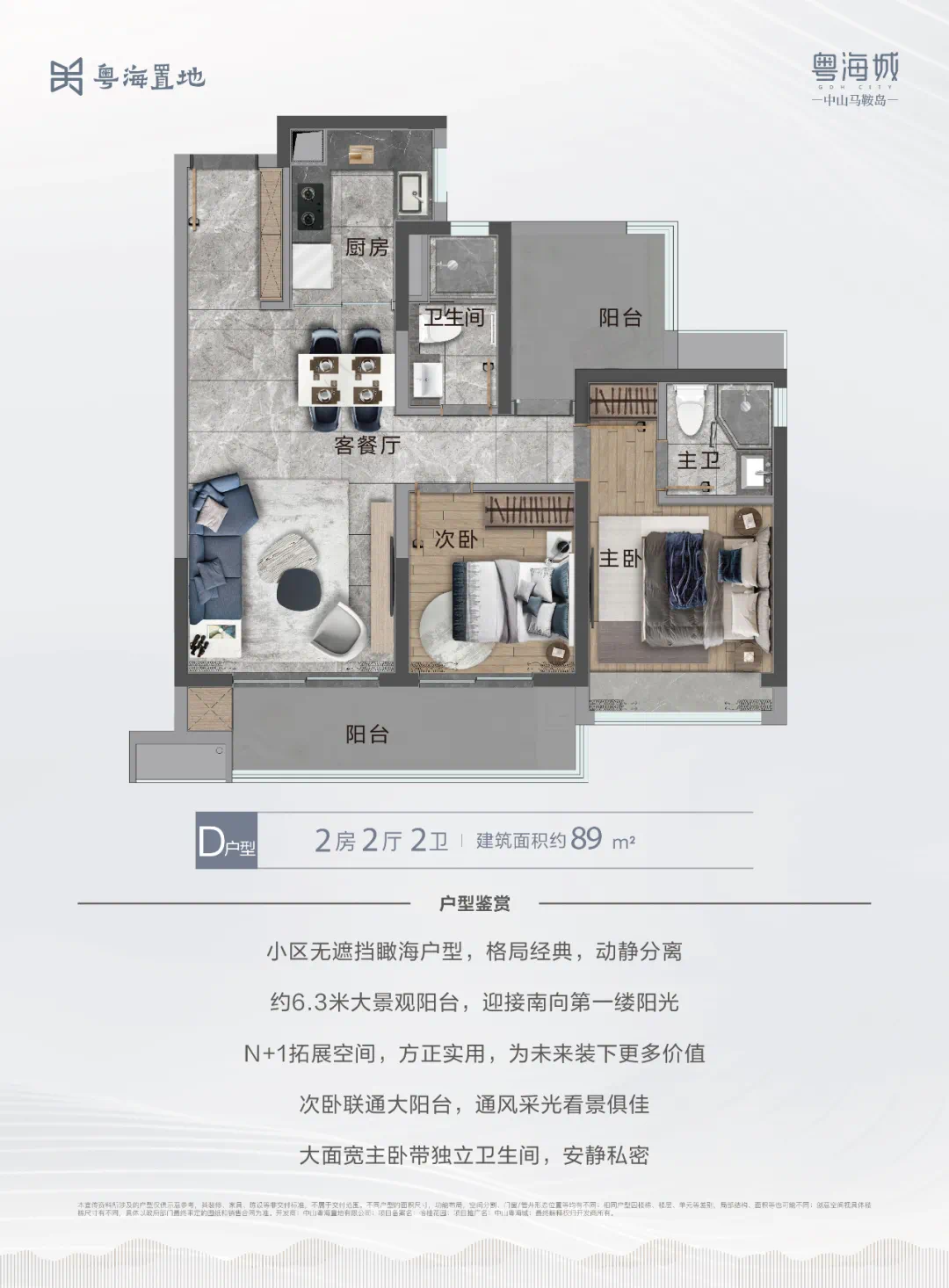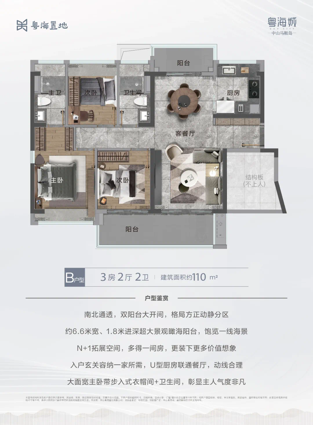 超大景观阳台,专属于你的空中花园为不辜负窗前约900米的绝美海景,中山马鞍岛粤海城在进行产品设计时,部分户型打造长约7.1米阔景阳台,约1.8米进深空间,让业主拥有私家宽阔观海阳台,并且卧室设置瞰海大飘窗,真正占有湾海头排浪漫海景,让壮阔大海对你全天候开放,生动感受被海环绕着的海湾生活。户户观景,尽享诗意栖居远眺揽海入怀,俯瞰一园风光,中山马鞍岛粤海城采取点式排布,2.5低密规划带来舒朗通透楼间距的同时,也带来无遮挡的视界,把更多的空间让位给景观,真正实现“户户有景,家家赏园”。