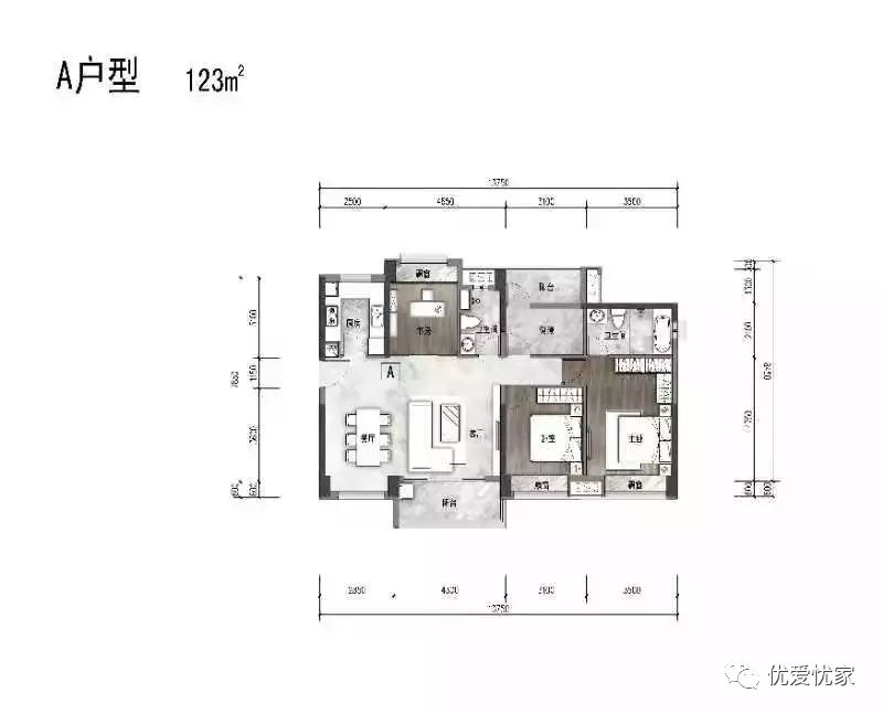 1、A 户型123㎡3+1房南北对流,动静分区, 7.1米阔绰整厅,4.3米大阳台,开阔明亮;