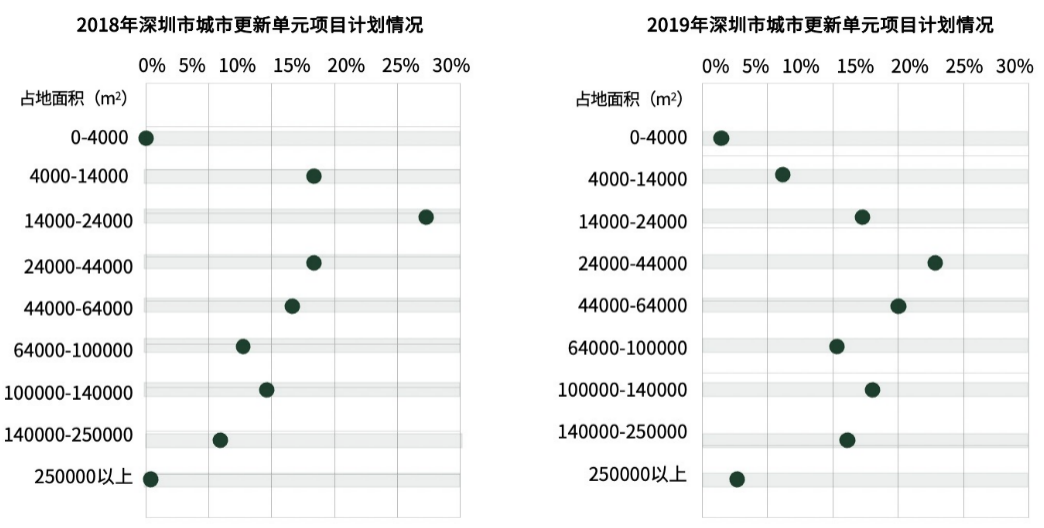 以市场成熟度以及立法完成度较高的深圳为例, 2018—2021年间,拆除重建项目无论是单项目体量或是计划数量都存在明显的增长趋势。其中,18年至20年3年内项目计划量以54%的年均复核增速增长至105幅。此外,21年上半年计划量达到58幅,高于去年同期水平。在单项目体量上,18年深圳城市更新出让项目的占地面积集中于0.4-1.4万方,经过3年的城市发展,至21年,供应的项目规模提高,集中在2.4-4.4万方,其中超25万方大体量项目占比以年均9%递增。