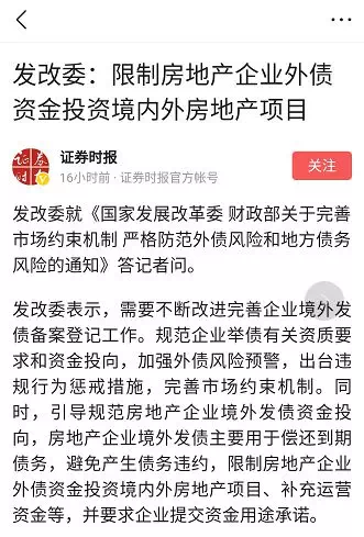 另外,除了七部委联合整治楼市的乱象新闻出来外,也有针对开发商的不利消息:海外发债渠道收紧。
