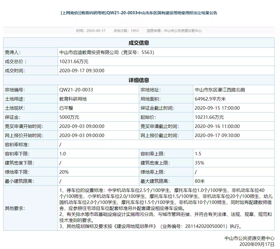 另外,地块右侧还将建中山排名前列所幼儿园到高中一贯制的国际学校。9月17日,该教育地块被中山市启迪教育投资有限公司拿下,将由蓝谷教育集团联手迪兴实业引入阿丁莱学院。