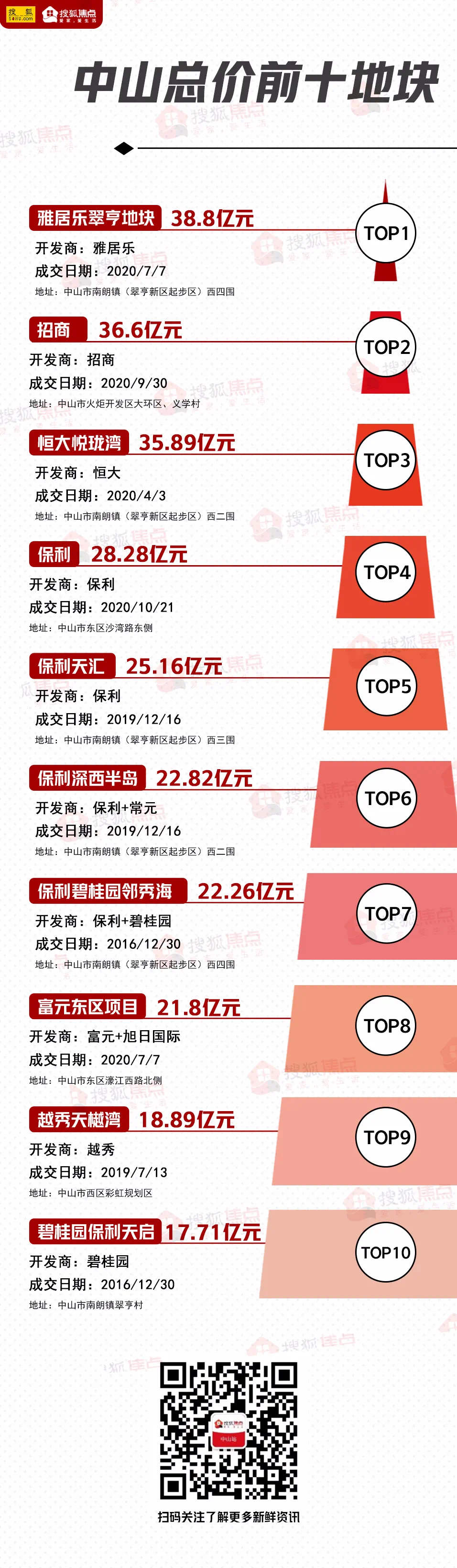 需要注意的是,本次上网竞价起始楼面价为5113元/平,即起始总价约27.5亿,出让不设保留价。通过翻查中山总价TOP10地块排名,算上刚不久前马鞍岛挂牌的0132地块(43亿起!又是马鞍岛!1.18万/平楼面价刷新全市纪录!),如果本宗地块能顺利拍出,即排在第6位。
