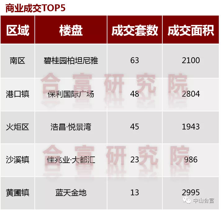 根据合富研究院监测:上周全市商业成交为225套,1.3万㎡,环比下降14%。在上周中山市各镇区商业成交排名里,南区成交63套排名排名前列,全为碧桂园柏坦尼雅成交;港口镇成交50套排名第二,多为保利国际广场成交;火炬开发区成交45套排名第三,全为浩昌·悦景湾成交。