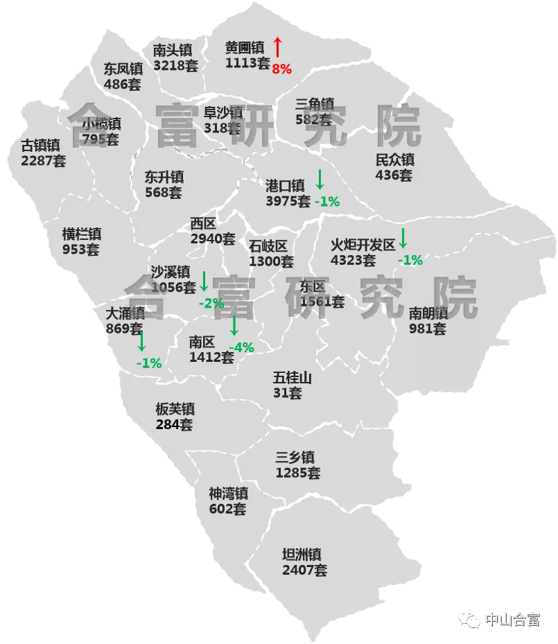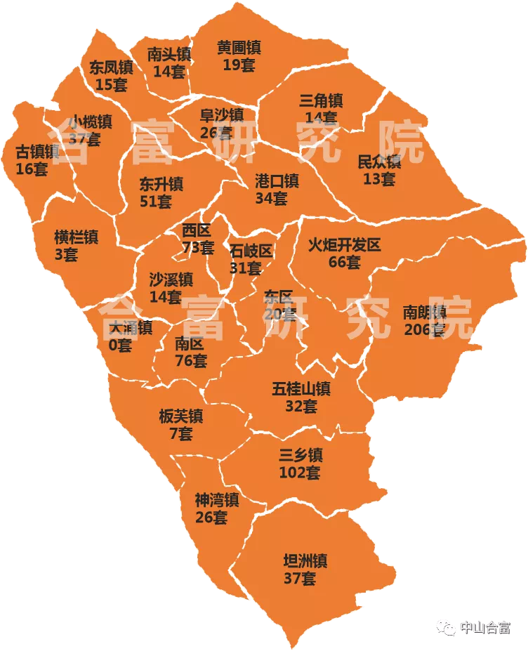 根据合富研究院数据监测:截止至2021年8月29日,中山市住宅库存46266套,533万㎡,环比下降4%。其中火炬开发区6250套居全市镇区住宅库存榜首,三乡镇6032套排名第二,坦洲镇5510套排名第三。