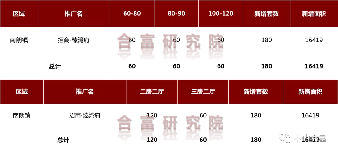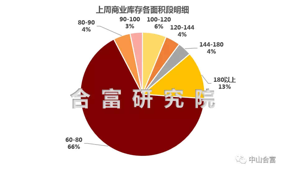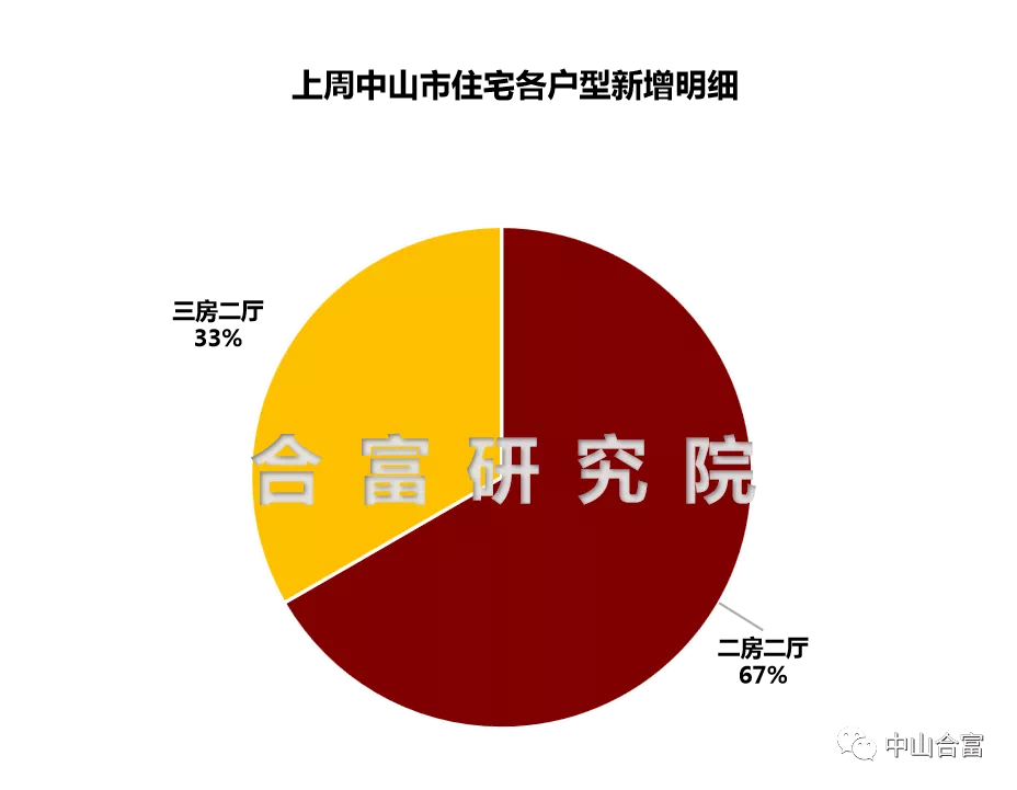 根据合富研究院监测:上周中山有1个住宅项目新增,共180套,新增货量为1.6万㎡。在上周住宅各面积段新增里,60-80㎡、80-90㎡、100-120㎡面积段均新增60套,各占比三分之一;在上周住宅各户型新增里,二房二厅新增120套占比较大,占比为67% 。