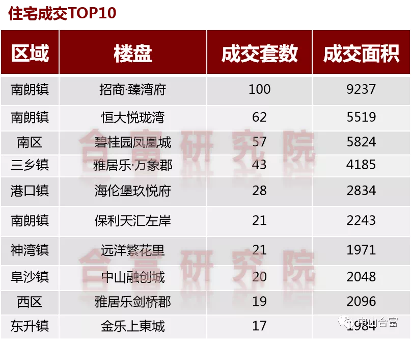 根据合富研究院监测:上周全市住宅成交为932套,10万㎡。在上周中山市各镇区住宅成交排名里,南朗镇成交206套排名首位,其中以招商·臻湾府成交最多;三乡镇成交102套排名第二,其中以雅居乐·万象郡成交最多;南区成交76套排名第三,其中多为碧桂园凤凰城成交。上周大涌镇无成交。