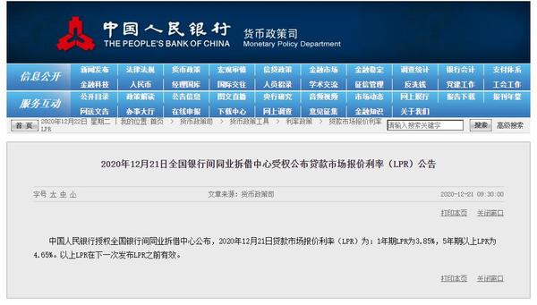 中国人民银行授权全国银行间同业拆借中心公布,2020年12月21日贷款市场报价利率(LPR)为:1年期LPR为3.85%,5年期以上LPR为4.65% 。两项报价利率均连续8个月保持不变。