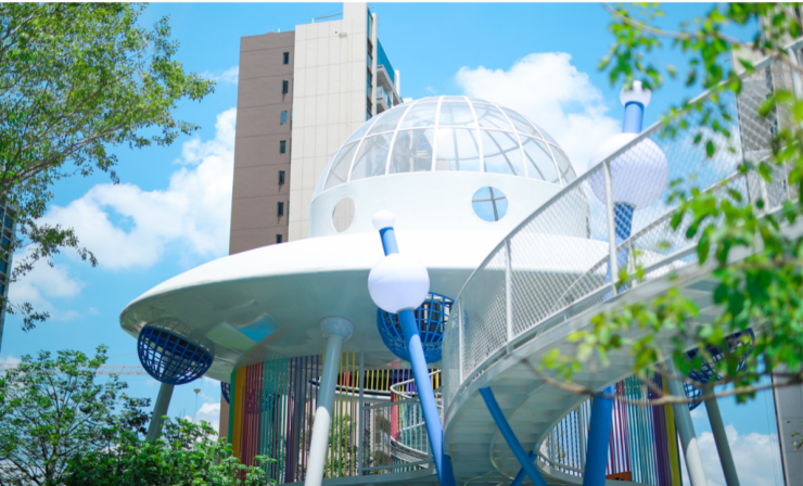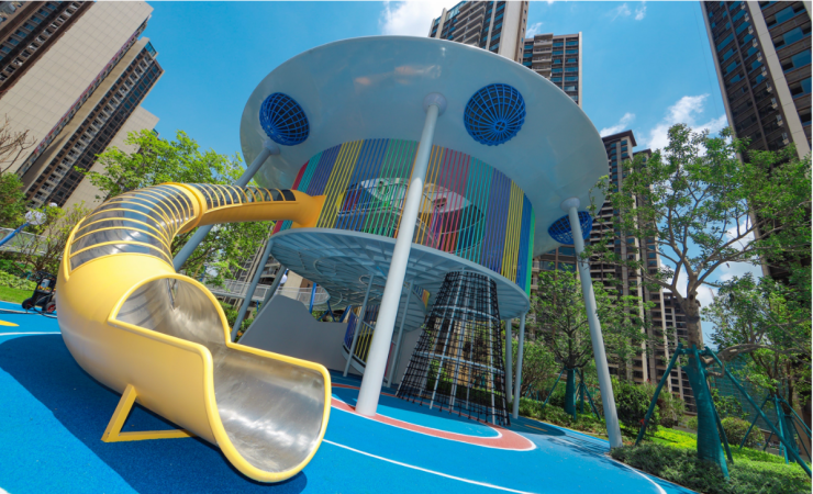 在江门,龙光龙湖·双龙天著这座占地1500㎡的星梦主题龙小湖乐园早已成为网红打卡地。乐园中,以星际飞碟为主体构架的形象尤其引人注目,包含三层主题空间,透明的圆顶设计,夜晚还能仰望星空,让孩子将视野拓展到更宏观的宇宙当中。穿梭在空中栈道、透明太空滑道中,荡漾在月亮秋千上,犹如身处科幻之境,让人沉浸其中。