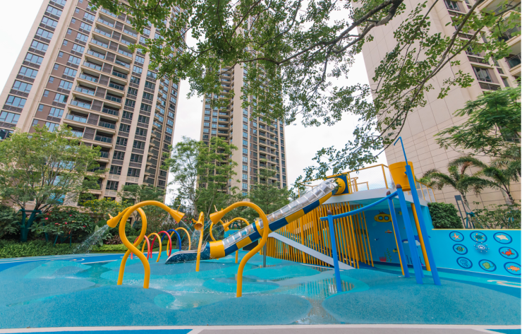 在中山,龙湖·春江紫宸的龙小湖乐园则是把海洋搬回了家,这座以海洋为主题的龙小湖海洋主题乐园,为孩子们配置了娱乐水桶、喷水花洒、洼地水池等娱乐设施,让孩子们可以自由踩水、玩水,其中航海风格主题滑梯更是贴合主题,为孩子营造海边撒欢的氛围。