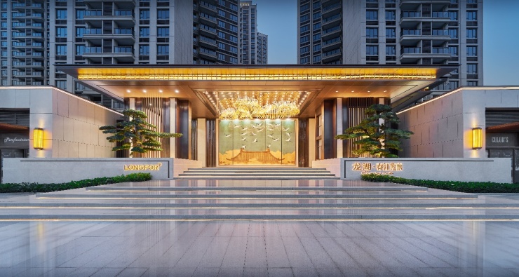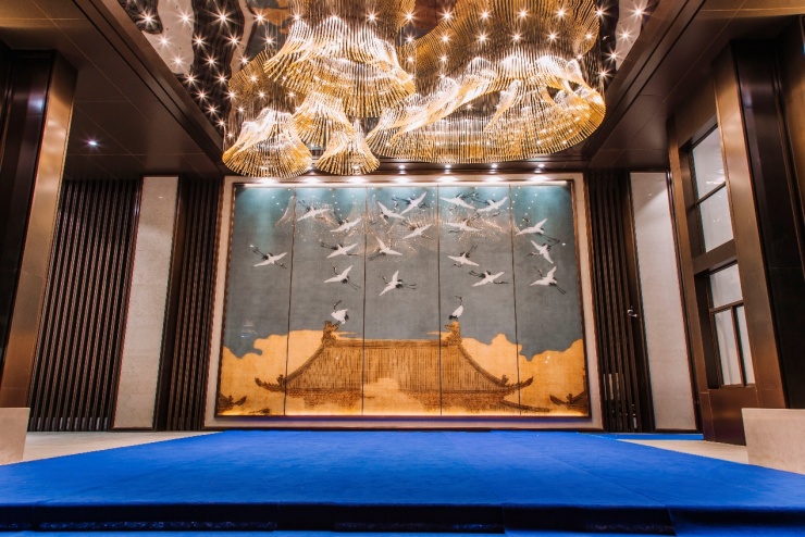 为此,在家门主入口中,龙湖景观设计师选取了庄严中透出神秘吉祥之气的北宋宋徽宗名画《瑞鹤图》进行了全比例复刻,搭配穹顶的黄色凤凰振羽吊灯相互辉映,为业主呈现最精致与仪式感的回家礼序。