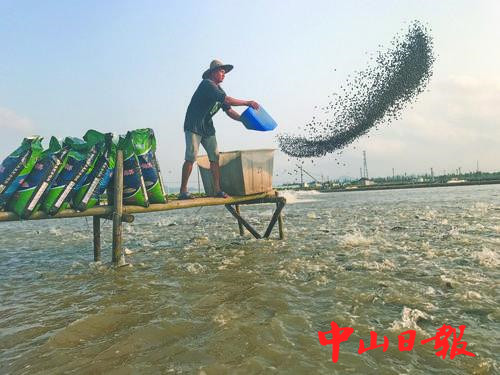 ▲义仓村,下午5点,养鱼场的工人开始投放鱼饲料。塘主林丙棠承包了村里的80亩鱼塘,专业养殖鲈鱼。