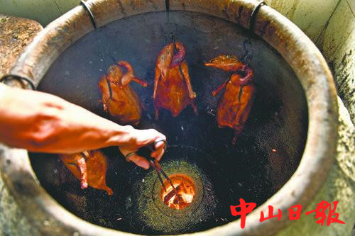 ▲为了保证烧鹅的鲜嫩,松涛居店主王松森在村内租了700亩鱼塘,这片鱼塘可同时容纳4500只活鹅,鹅粪用作鱼饲料,从而实现立体养殖。