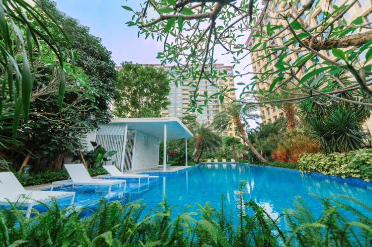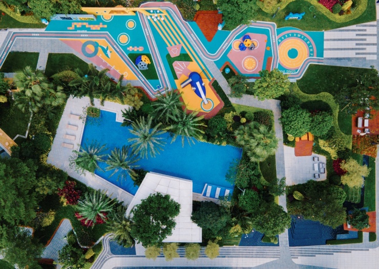 园区最中心处,是一方以巴厘岛著名度假酒店阿丽拉酒店为灵感打造的滨海式泳池乐园,针对不同年龄段配置深水区、浅水区,泳池选用了Tiffany蓝马赛克,与天空颜色相呼应,营造了轻松愉悦的空间氛围。周边种植了专业工程师精选的热带棕榈科植物,还设置了休闲休憩区,给业主带来家门口的度假感受。