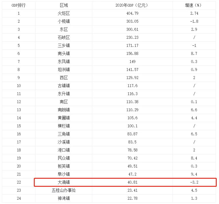 无论新房,还是二手房,大型房企的身影几乎消失了,答案已经呼之欲出。或许有人会问,大涌的GDP、产业、版块规划等情况呢?总会有它自己的亮点吧?不着急,答案都在下面。根据广东省地区生产总值统一核算结果,2020年中山市地区生产总值为3151.59亿元,同比增长1.5%。值得注意的是,增速出现负增长的有三个镇区分别是小榄、三乡和大涌。其中,大涌以-3.2%的数据,排在倒数排名前列位。