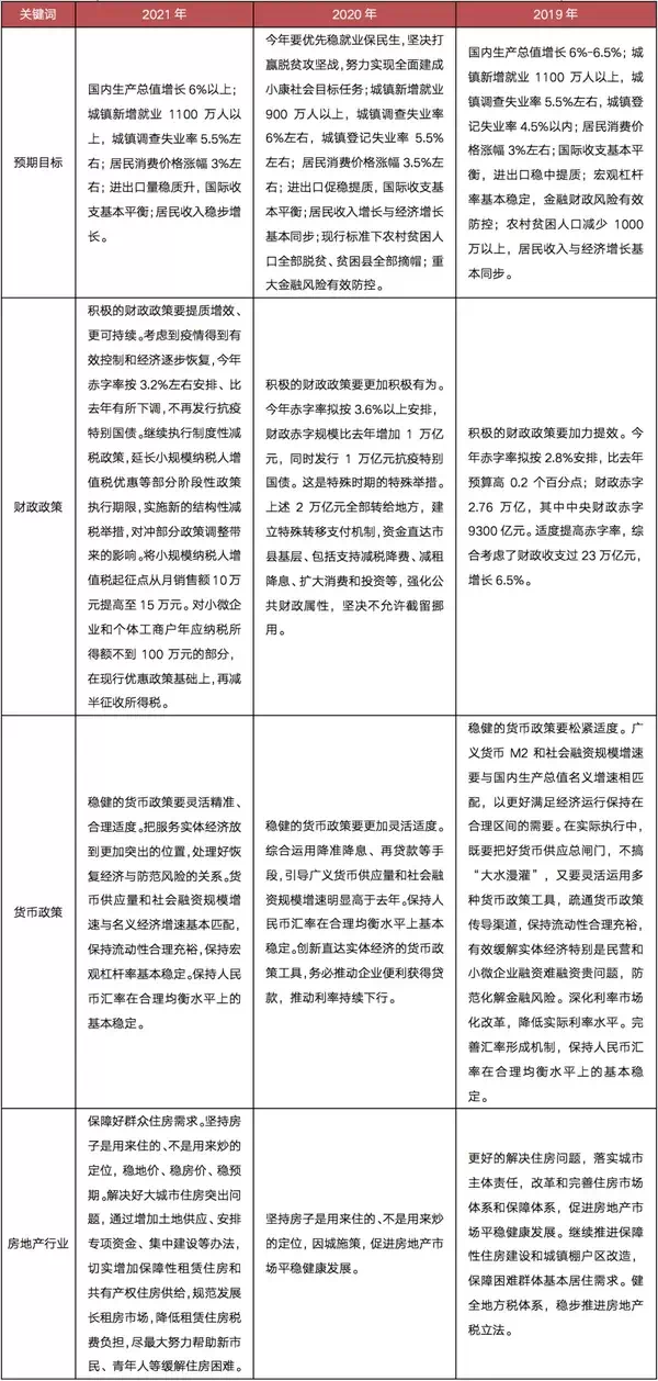 具体而言,房地产方面仍然贯彻“坚持房子是用来住的、不是用来炒的定位”,这是自2018年政府工作报告首次提出“房住不炒”后,连续两年再次重申。不同的是,2021年政府工作报告新增了“稳地价、稳房价、稳预期”的表述,现阶段地价、房价仍是不能触碰的红线。